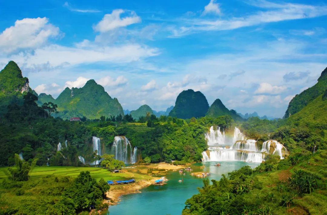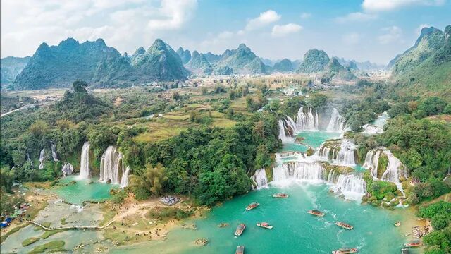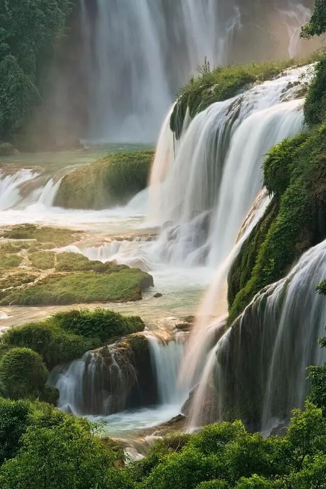 瀑布气势磅礴、蔚为壮观,与紧邻的越南板约瀑布相连,
