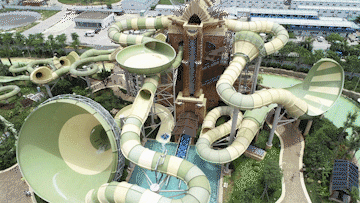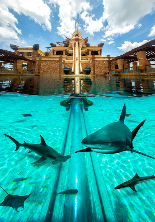 在接近25.1米高的起点纵身一跃,近乎垂直的水滑道看着就肾上腺素飙升!还有鲨鱼群在前方等待着你,好嗨哟,感觉人生已经到达了巅!峰!