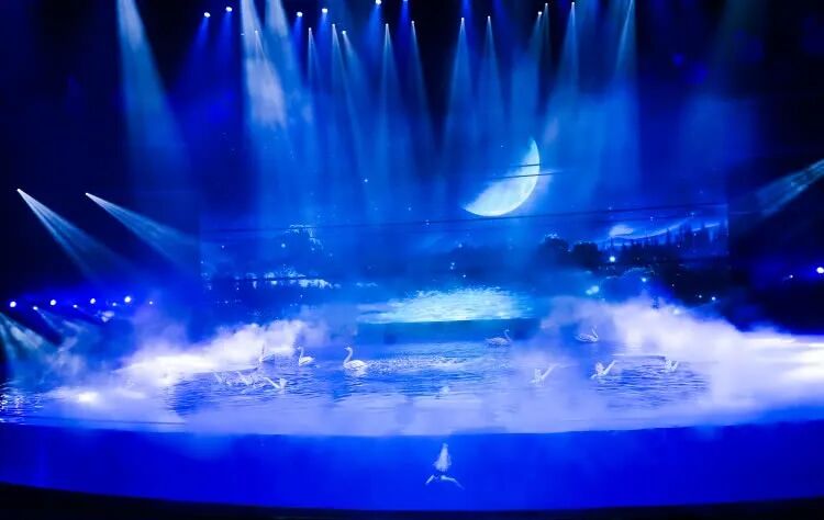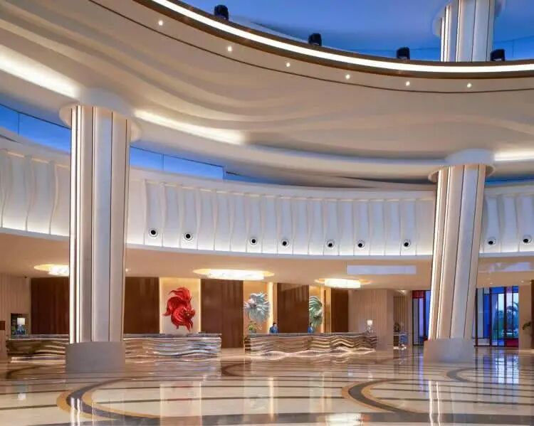 中间的大型玻璃艺术作品,价值超过2千万,由捷克水晶艺术工坊LASVIT 专为酒店定制,整体作品由色彩斑斓的静态玻璃珊瑚与空中动态上下的玻璃小鱼组合而成,夜幕降临,美到令人窒息。