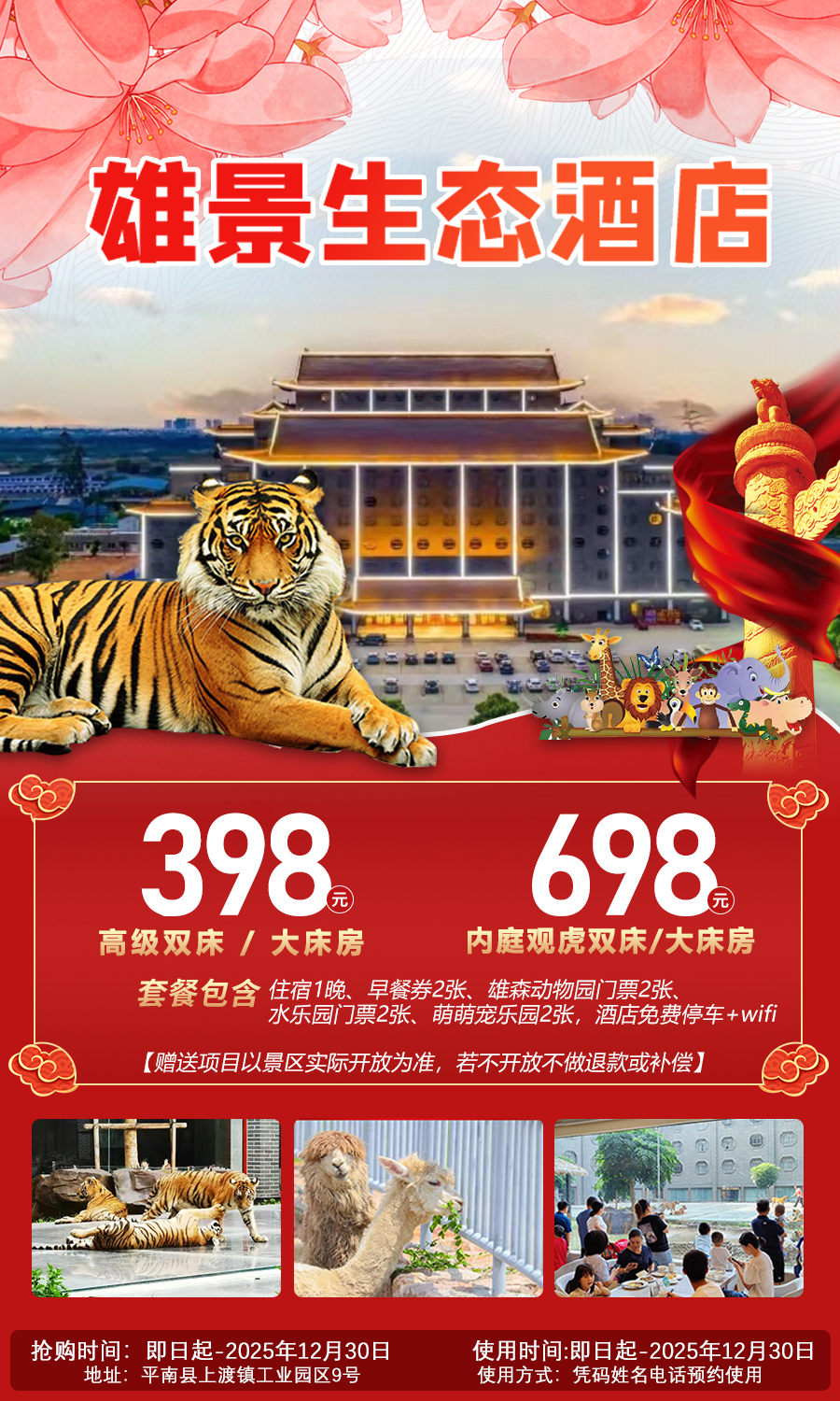 雄景生态酒店坐落于广西平南县雄森生态旅游度假区内,与雄森动物大世界、 雄森生态农业园 、雄森酒业酒文化体验园四位一体,构成一个集豪华酒店、动物主题公园、生态农业观光、酒文化展示、高档餐饮、娱乐休闲、研学旅行教育于一体的大型综合度假区,占地面积达2000余亩。2021年1月16日盛大开业,喜迎宾客,酒店按五星级标准精心匠造,建筑面积达80000㎡,建筑风格古朴典雅,600多间客房豪华大气,酒店以“与虎同住”“家庭亲子游梦想之地”为主题,用心匠造五星级般奢华舒适休憩方式,期待与您的旅程美丽相约!