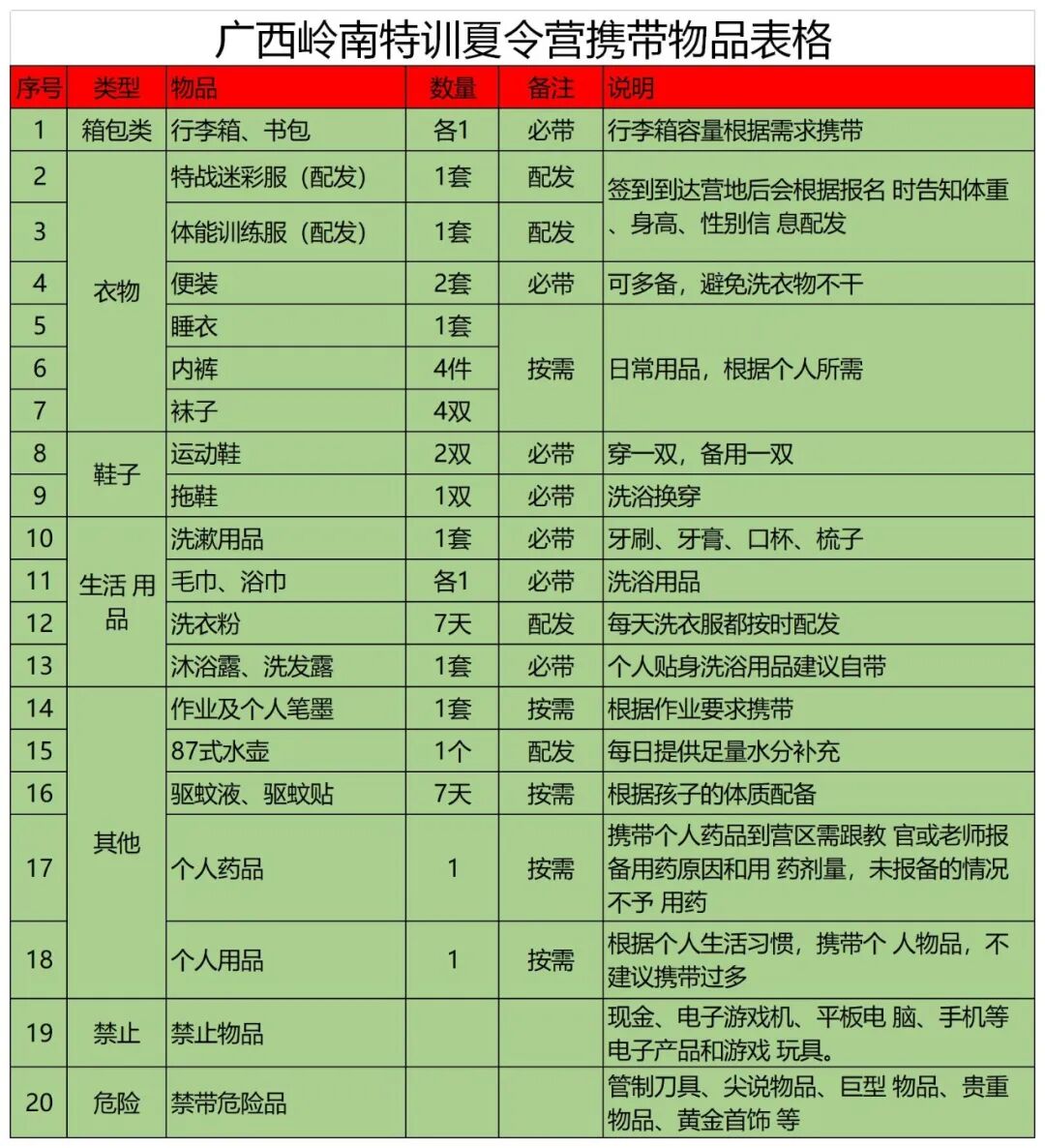 答:一双防滑浴室拖鞋,两套换洗衣物、内衣裤、袜子,不超过100元的零花钱。孩子有特殊情况的如需定时服药的,把药品和使用方式对接给我们的负责老师。
