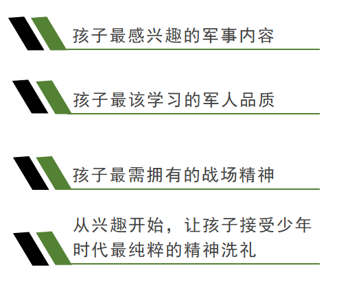 多年来针对青少年精心打造,以“安全、专业、放心”为宗旨,力求通过全方位、立体化、直观性的沉浸式军事体验为青少年提供一个扩展视野、历练自我、强健体魄、陶怡情操的体验式成长平台。