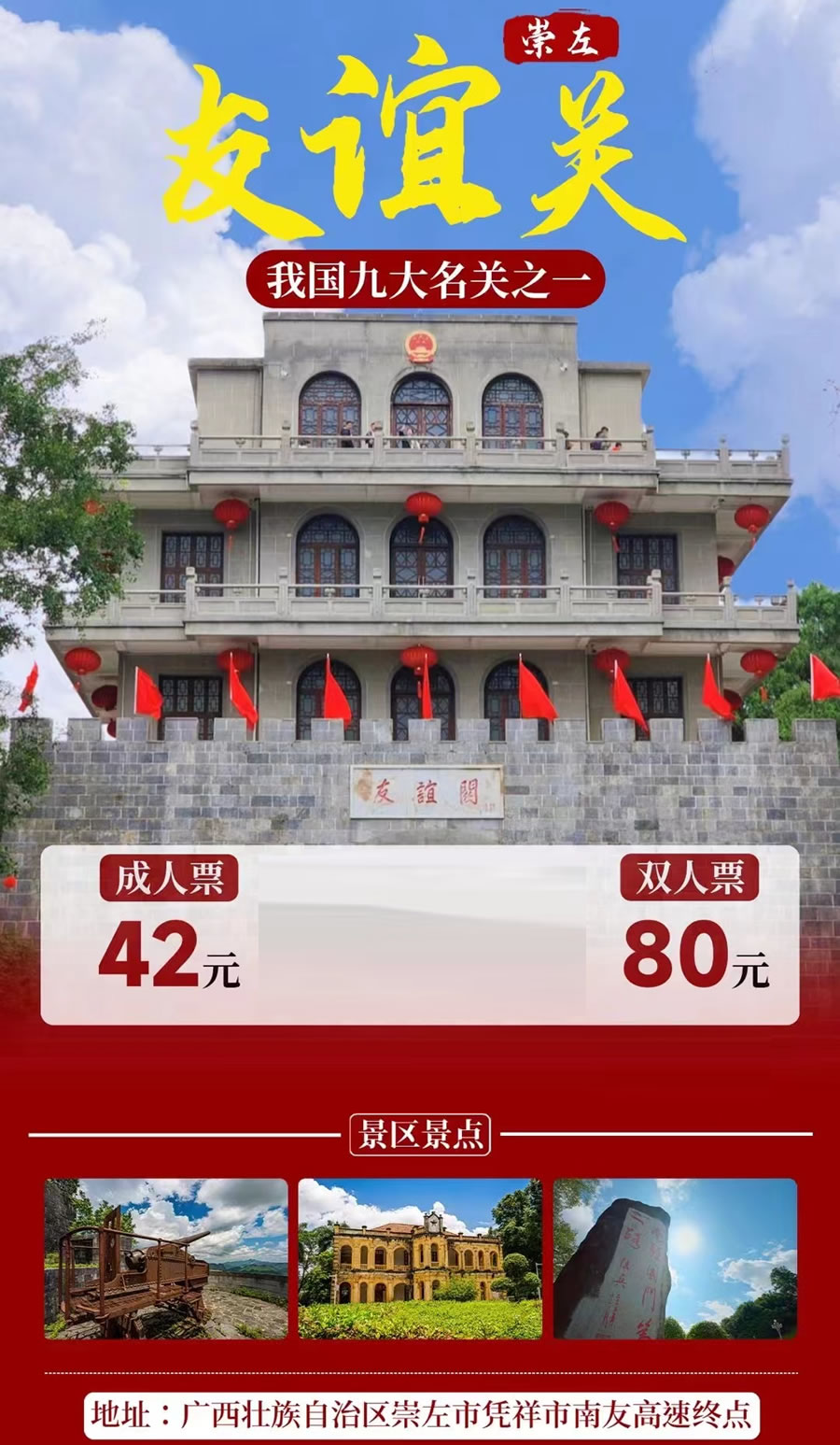 【友谊关景区】42元抢单人票,80元抢双人票,关楼今亦巍峨屹,沉浸式体验边关国风生活,约上好友来,带你一秒穿越千年友谊关,千年雄关,焕发活力!